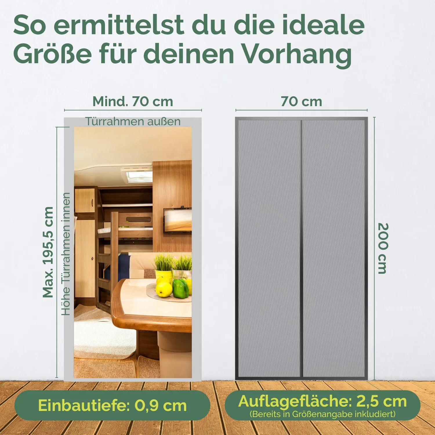 Vor dem Kauf solltest du die Abmessungen deiner Wohnwagentür genau messen. Unsere Wohnwagen Fliegengitter Tür bieten wir in mehreren Größen an. In unseren Produktdaten findest du eine genaue Anleitung, wie du deine Tür ausmessen kannst, um die richtige Größe kaufen zu können.